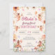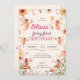 Esta tarjeta de invitación presenta un diseño caprichoso con temática de hadas, perfecto para la celebración del primer cumpleaños de un niño. El fondo es crema suave con elementos florales acuarelas en tonos pastel que le dan un toque delicado y mágico al jardín. Se reparten por todas partes hadas ilustradas con vestidos flotantes y alas translúcidas, algunas sosteniendo globos, regalos o una torta de cumpleaños, lo que crea una sensación de encantamiento juguetón. Las mariposas revolotean entre las flores, realzando el ambiente etéreo y de cuentos. El texto es lúdico pero elegante, combinando fuentes cursivas y negrita en tonos rosados y púrpura para resaltar el nombre, evento y detalles clave del niño. Este producto es una invitación digital o impresa de cumpleaños diseñada específicamente para un niño pequeño, que atrae a los padres que planean un fiesta con temática de hadas. El público objetivo incluye a familiares, amigos y otros invitados a celebrar el primer cumpleaños de su hijo en un ambiente encantador, inspirado en el jardín.