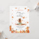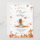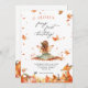 Invitación al primer cumpleaños de Fall Fairy con un Fox y un pixista con alas y hojas de otoño y calabazas
