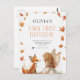 Invitación al Primer Cumpleaños de la Hada de Otoño con un Zorro y una Pixie con Alas y Hojas de Otoño