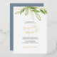 Esta invitación a bodas verdes muestra sus nombres en una elegante tipografía de escritura de Relieve metalizado manuscrita con detalles del evento en una fuente clásica de serif gris carbón vegetal sobre un fondo blanco fresco con una parte superior de mis hojas botánicas acuarelas originales en tonos sabios y verdes. La tarjeta de invitación se revierte a un color azul polvoriento de cortesía. Una elección elegante para bodas casuales en el jardín. Para ver toda la suite de papel boda de Victoria Grigaliunas de DoTellABelle, visita www.zazzle.com/dotellabelle Hermosa invitación a la boda de Relieve metalizado real