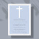 Invitación al bautismo de personalizable, en tonos azul pastel y blanco, con una cruz de Relieve metalizado de personalizable y nombre. Elige de un Relieve metalizado de oro, oro rosa o plata.