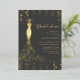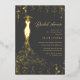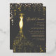 Invitaciones a una ducha de novias con fondo dorado y purpurina y escritura personalizado con un verdadero purpurina de Relieve metalizado y un elegante vestido de novia. Elija entre dos colores de fondo y elementos coincidentes.