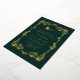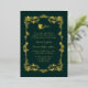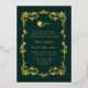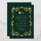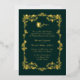 Invitación a la boda de Relieve metalizado de oro ordenado en Kelly Green con vinas rosas de oro enmarcando el área de texto y un único rosa de tallo largo en la parte superior del área de texto. Personalice el texto del Relieve metalizado para adaptarlo a sus necesidades bodas.