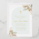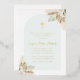 Un Relieve metalizado de pampas cruza la tarjeta botánica de invitación a la primera comunión. Los colores y el texto se pueden personalizar.