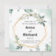 Este diseño es perfecto para un boda rústico, otoño, invierno, campo o al aire libre. Estas impresionantes invitaciones nupciales cuentan con un marco geométrico de Relieve metalizado dorado rodeado de flores de color neutro con Relieve metalizado dorado y acentos de hojas. Elegante y con un sencillo fondo blanco.