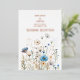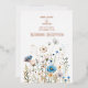 Una hermosa invitación blanca con Rosa Gold Text e imagen de flores silvestres de campo en azul, amarillo y crema. La parte posterior es un bonito texto en color oro rosa con todos los detalles bodas en negro con la misma imagen de las flores silvestres.