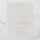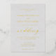 Una clásica y elegante invitación a la boda de lino gris con fondo impreso de lino con un guión de Relieve metalizado dorado real con la palabra "boda" en una gran caligrafía de hobby.