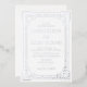 Invitaciones a bodas de arte moderno con detalles de tu boda enmarcadas en un marco Art Deco de Relieve metalizado plateado con un fondo blanco. Diseñado para coordinar con nuestra colección de bodas Art Deco Moderno.