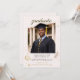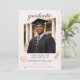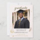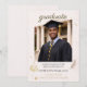 Tema de retrato académico con cálidos acentos dorados sobre un suave fondo crema, con una foto central del graduado enmarcada por detalles sutiles de confeti y pequeños íconos académicos. La tipografía script y serif se combina con un diseño limpio adecuado para anuncios de inicio de clases universitarias y reuniones de celebración en el campus.