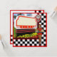 Invitación a la luz de las perlas cuadradas con una imagen de un letrero retro de los años 50, un reloj de invierno rojo y un vintage servidor femenino de los años 50 en un tablero de ajedrez blanco y negro. La parte trasera tiene un espacio blanco para los detalles de tu fiesta con un borde de rayas rojas en un tablero de ajedrez blanco y negro. Vea la invitación "50s Retro Diner", tarjeta "50s Retro Diner Gracias", sobre, bolsa de favores, caja de favores, bolsa de regalo media, etiqueta y pegatina. Ver toda la colección Invitación de los años 50 en los INVITES | Sección Invitaciones.