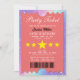 Una invitación para un fiesta es una manera única y creativa de invitar a los invitados a un evento especial, que se asemeja a un boleto de admisión a un concierto, una película u otros eventos emocionantes. Este tipo de invitación no sólo proporciona detalles esenciales sobre el evento, sino que también agrega un elemento divertido y temático que puede excitar e involucrar a los invitados. A continuación se presentan algunas características clave y aspectos de una invitación a un fiesta para comprar un billete