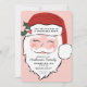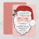 Esta invitación a Navidades es perfecta para tu próxima fiesta de vacaciones y cuenta con una alegre cara de Santa sobre un fondo rosa con un texto que dice "Estás invitado a un fiesta Navidad" en letras negras en el gorra de Santa. Todos los detalles del fiesta están listados en la barba de Santa. La espalda tiene rayas diagonales rosadas y rojas.