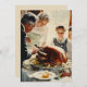 Esta imagen representa una escena clásica del Día de Acción de Gracias que recuerda a ilustraciones antiguos. Cuenta con una familia reunida alrededor de una mesa, alegremente mirando mientras un hombre mayor tallaba un gran pavo asado de color dorado y marrón. La cálida luz que entra por la ventana ilumina los rostros de los miembros de la familia, resaltando su felicidad y anticipación. La mesa está elegantemente decorada con un abundante festín, que incluye uvas y guirnaldas decorativas alrededor del pavo. El ambiente general evoca una sensación de nostalgia, calidez y celebración.