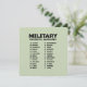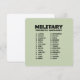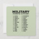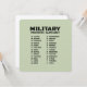 Alfabeto Fonético Militar Táctico de Alfa a Zulu presenta el alfabeto fonético completo desde Alfa hasta Zulu en un diseño audaz y fácil de leer. Este diseño táctico de alfabeto fonético militar de Alfa a Zulu funciona perfectamente como tarjeta de invitación o tarjeta de mensaje para eventos, reuniones y ocasiones especiales con temática militar. Claro, práctico y distintivo, el diseño táctico de Alfabeto Fonético Militar Alfa Zulu es ideal para entusiastas de lo militar, operadores de radio y cualquier persona que valore la comunicación de señales.