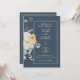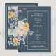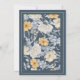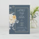 ALGO AZUL! La invitación de boda floral tradicional presenta un diseño floral elegante en azul y blanco sobre un fondo apagado con borde dorado
