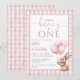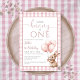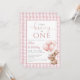 Esta encantadora invitación para la primera fiesta de cumpleaños presenta un pequeño y lindo bebé conejo sosteniendo globos, y un fondo de cuadros rosados. Diseñado por Thisisnotme©
