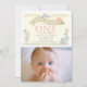 Esta adorable "¡Un conejito está convirtiendo a uno!" La invitación con fotos de primer y primer cumpleaños incluye un conejo gris saltante y un conejito gris sentado con hierba verde con flores y follaje sobre un fondo amarillo claro enmarcado por un borde blanco. El reverso presenta un fondo verde claro con rayas de diagnóstico blancas. Personalice sus necesidades. Puedes encontrar más productos a juego en mi tienda.