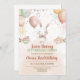 ¡Celebra el primer cumpleaños de tu pequeña con esta encantadora Conejita es una invitación! Con un conejo con coronas de margarita, globos de conejo pastel y delicadas mariposas acuáticas, este diseño es perfecto para una mágica fiesta de cumpleaños con temática de jardín.