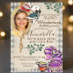 Esta caprichosa y encantadora invitación a la fiesta presenta un colorido tema de cuento de hadas de Alice in Wonderland. El gato de Cheshire está situado en la esquina inferior derecha, al lado de un par de telecabinas. El conejo blanco se sitúa cerca de la parte superior, frente a un espejo o cristal dorado. Una foto de ejemplo se coloca dentro del espejo que se puede reemplazar con su propia foto o imagen personalizado. Un patrón de arlequín azul y negro acentúa el borde. Es perfecto para una fiesta de cumpleaños, fiesta de té u otra celebración con temática Alicia en el País de las Maravillas.