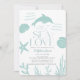 This chic "All I Sea is Love" bridal shower invitation features a dolphin, seashells, a coral, and starfish in turquoise blue. The reverse side features a turquoise blue background with waves. Personalize it for your needs. You can find matching products at my store.