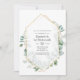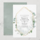 Invitación para el almuerzo de damas de honor con herbario de eucalipto en tonos verdes con marco geométrico dorado y reverso de salvia plateada en un bosque salvaje.