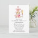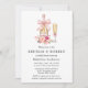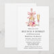 Invitación moderna y elegante para Despedida de Soltera y Brunch con Botella de Champán y Copa con Lazo de Arco Rosa en Acuarela. Características texto minimalista en negro y blanco y fondo blanco. Incluye flores rosadas en acuarela y vegetación botánica.