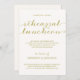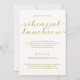 Este elegante, oro e invitación blanca del alumerzo del ensayo ofrece un caprichoso, fuente manuscrita de la caligrafía del vintage-estilo. Los detalles del acontecimiento se pueden modificar para requisitos particulares para su fiesta.