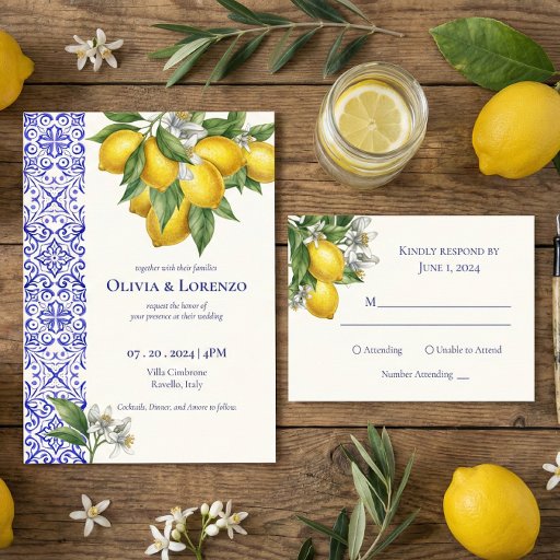 Invitación Amalfi Coast Lemon & Blue Tile Wedding Invitation