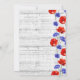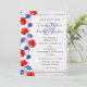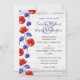 Hermosas y vibrantes amapolas rojas y preciosas flores azules de aciano ofrecen un enérgico toque de color sobre un fondo de madera rústica con baño de cal blanca. Este diseño de estilo moderno y de granja está lleno de encanto silvestre para una romántica boda campestre.