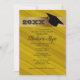 Invitación a una fiesta de graduación de amarillo mostaza / oro con una franja dorada y una gorra negra de graduación.