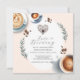 Celebra a la novia con esta cálida y moderna invitación de desayuno nupcial de café, parte del tema encantador y acogedor "El amor está en la mezcla". Diseñada en tonos suaves de marrón con delicadas ilustraciones de acuarela de lattes, espresso y granos de café, esta invitación personalizada de desayuno nupcial es una excelente opción para cualquier amante del café.