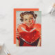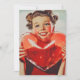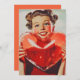 Una nostálgica imagen inspirada en los años 50 de una joven sonriente sosteniendo un objeto brillante, hueco, en forma de corazón. Su atrevida vestimenta roja y su alegre expresión evocan calidez, alegría y romance intemporal, capturando el encanto vintage de la época.