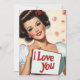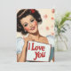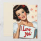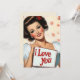 Un ilustracion vibrante en el estilo clásico de los años 50. La imagen muestra a una mujer glamurosa con rizos vintage, maquillaje audaz y una sonrisa radiante. Lleva un cartel con un mensaje de amor, "Te amo", puesto en un fondo de delicadas rosas rosas. La estética general capta el ambiente romántico y lúdico del arte de base de mediados de siglo.