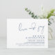 Esta es la tarjeta de invitación de la fiesta de elopement de boda, con diseño minimalista / escritura Azul Marino (Amor y Alegría).