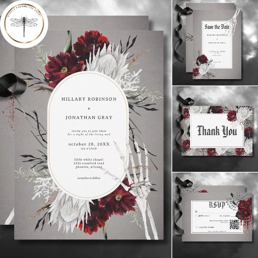 Invitación Amor y huesos Boda rojo floral espeluznante