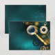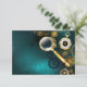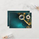 Una lupa antigua con mango dorado y lente convexa sobre el fondo verde con los engranajes dorados y un reloj antiguo. Estilo Steampunk.
