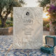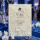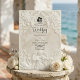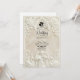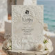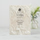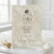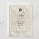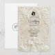Anuncie su unión con la grandeza atemporal del arte del siglo XVII. Este diseño evoca el romanticismo de una catedral europea, perfecto para parejas tradicionales. Este diseño presenta un sofisticado efecto de falso bajorrelieve, simulando la apariencia de piedra antigua tallada en una paleta monocromática de crema cálida, marfil y beige. La composición está enmarcada por un arco arquitectónico clásico adornado con volutas ornamentadas de acanto y rosas. En el encabezado, una delicada ilustración representa a un ángel barroco tocando el violín, flanqueado por dos cisnes elegantes que se enfrentan, simbolizando la asociación eterna. Un sutil icono de silueta de novia y novio ancla el texto. Esta es una imagen impresa plana con un efecto de textura de piedra visual, no material realzado o relieve 3D.