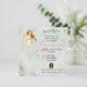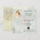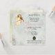 Una invitación bautismal para una niña. Un ángel antiguo sobre un fondo con textura vintage de estilo desgastado. Una dulce imagen de un ángel tocando el violín con flores en el cabello. Esta imagen vintage parece desgastada y desvanecida por el paso del tiempo, y tiene un tono amarillento desgastado. El fondo es una delicada textura desgastada en blanco grisáceo con un papel de estilo vintage.
