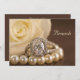 Sigue celebrando a los recién casados la mañana después de su ceremonia de matrimonio con la elegante invitación de Brunch Post Boda y Anillo de Diamante Ovalado y Rosa Blanca. Esta elegante invitación personalizada para Desayuno o Almuerzo Después de la Boda cuenta con una fotografía floral de un anillo de compromiso de diamante ovalado, collar de perlas blancas y flor de rosa blanca con fondo de seda marrón.