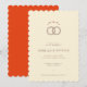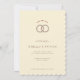 Esta elegante invitación de boda presenta un diseño minimalista con un fondo beige cálido, creando una atmósfera acogedora. El diseño incluye dos diseños circulares superpuestos que se asemejan a anillos de boda, adornados con pequeños puntos decorativos y coronados por cinco corazones rojos en formación de arco, lo que añade un toque de romanticismo. La tipografía utiliza una fuente clásica serif para un aspecto formal pero accesible, con espacios personalizables para nombres, fechas y ubicaciones. El estilo general es minimalismo moderno, centrado en la claridad y la sofisticación, perfecto para una celebración formal.