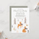 Esta linda invitación para fiesta presenta un tema de bosque invernal con un diseño de arte popular escandinavo. Varios animales del bosque están representados entre árboles en un bosque invernal. Un pequeño zorro está en la parte inferior con un pájaro encima. Un cervatillo está colocado en el centro, y un pequeño conejo está a la izquierda. Bayas y follaje acentúan la imagen. Es perfecto para un baby shower de invierno, cumpleaños o fiesta de Navidad.