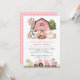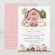 Invita a amigos y familiares con estilo y marca el tono de tu día especial con esta encantadora invitación de cumpleaños. El diseño presenta animales de granja (vaca, caballo, oveja, cerdo, gallo, gallina), granero rosa y tractor rosa sobre fondo blanco.