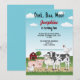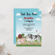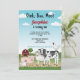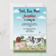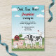La ilustración original de dibujos animados de Destei de animales de granja lindos que incluye una vaca negra y blanca, un cerdo rosa, una oveja y dos pollos. En la parte posterior hay un granero rojo en colinas verdes y hierba junto con un árbol y algo de heno. El cielo es azul con algunas nubes. Uno de los pollos está colocado encima de la vaca. Personalice las áreas de texto de muestra con los detalles de su fiesta.