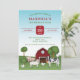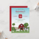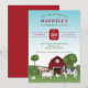 El ilustracion personalizado original de Destei de animales de granja incluyendo un cerdo, una vaca, una oveja y tres pollos. Una de las gallinas está parada encima de la vaca. Los animales se encuentran en un entorno rural frente a un granero rojo que tiene una valla marrón. También hay árboles, verdes colinas verdes y un arbusto de flores en el lugar. El cielo es un agradable gradiente azul. El texto de ejemplo se coloca de forma decorativa que resalta la fecha con un cartel rojo. Los colores del texto son rojo y verde, que coinciden con el esquema de color general. Este diseño es ideal para fiestas de cumpleaños de niños, por ejemplo.