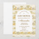 Un diseño de safari de cuento de hadas con estilo que presenta suaves animales bebé de acuarela, incluyendo leones, jirafas y elefantes rodeados de suave vegetación de la jungla y un delicado fondo botánico. La paleta cálida y neutral de crema, oro miel y suave oliva crea una estética atemporal inspirada en la naturaleza, mientras que el diseño arqueado elegante proporciona un espacio hermoso para los detalles del evento.