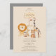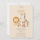 Esta invitación personalizada presenta un tema de fiesta de cumpleaños de zoológico en un fondo de color beige. Una imagen de varios animales bebé de zoológico están parados cerca de un letrero de madera. Entre los animales hay un león bebé, un lémur, un cocodrilo, un cachorro de tigre bebé y una jirafa.