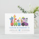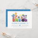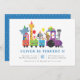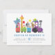 Invitación a la fiesta de cumpleaños de los niños con temática animal, que incluye una jirafa, un elefante, un perro y un conejito con equipo de cumpleaños sentado en un tren.