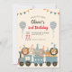Esta adorable invitación personalizada de cumpleaños incluye una colección de animales de safari bonitos y extravagantes, todos con gorras fiestas coloridos, en un encantador tren.