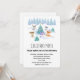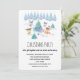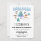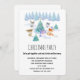 Invitación de navidades con una escena de Navidades caprichosos. Felices animales del bosque bailando alrededor de un árbol de Navidad decorado con regalos debajo. Diseño acuático festivo.