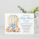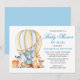 Moderno y elegante acuarela Bebé Animales Balón de aire caliente Baby Shower por invitación de correo. Los animales bebés incluyen Elefante, Mono, Giraffe, Rinoceronte, Cebra y León. Texto azul.